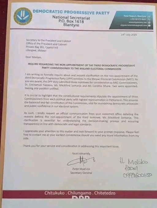 The party has written to OPC seeking clarification on the delays in appointing Somanje to the position.