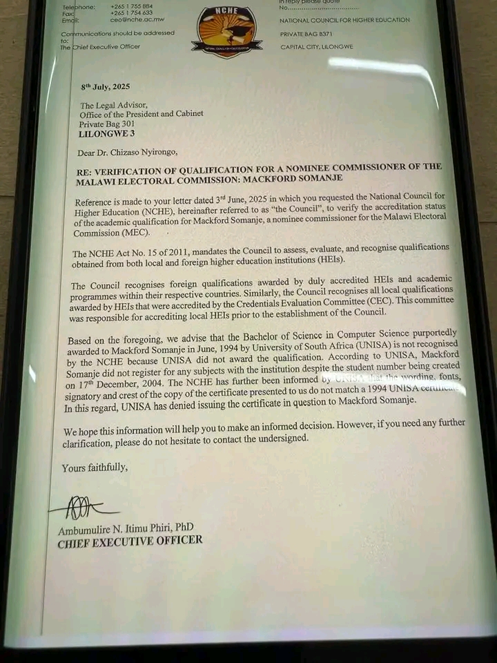 The National Council for Higher Education (NCHE) has rejected Somanje’s qualification, casting doubt on his eligibility for the position.